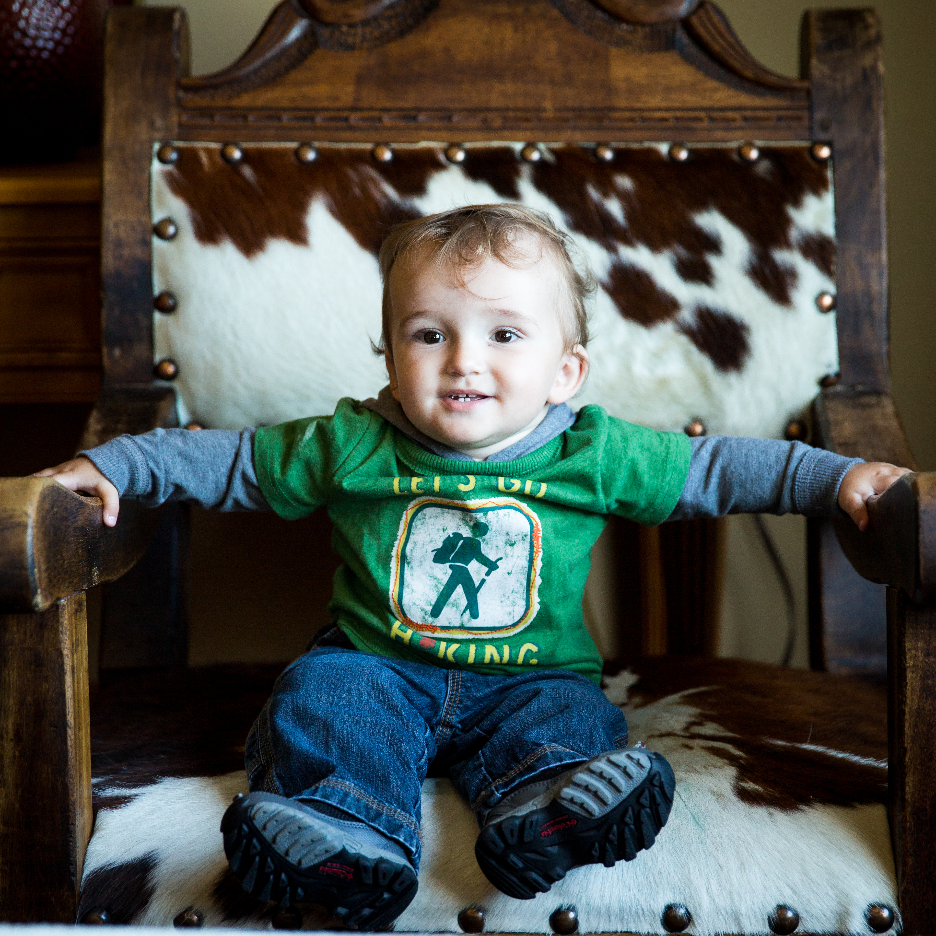 Cool chair at Mountain Top Inn, Cool kid getting ready to go hiking in his cool shirt that says "Let's go hiking"