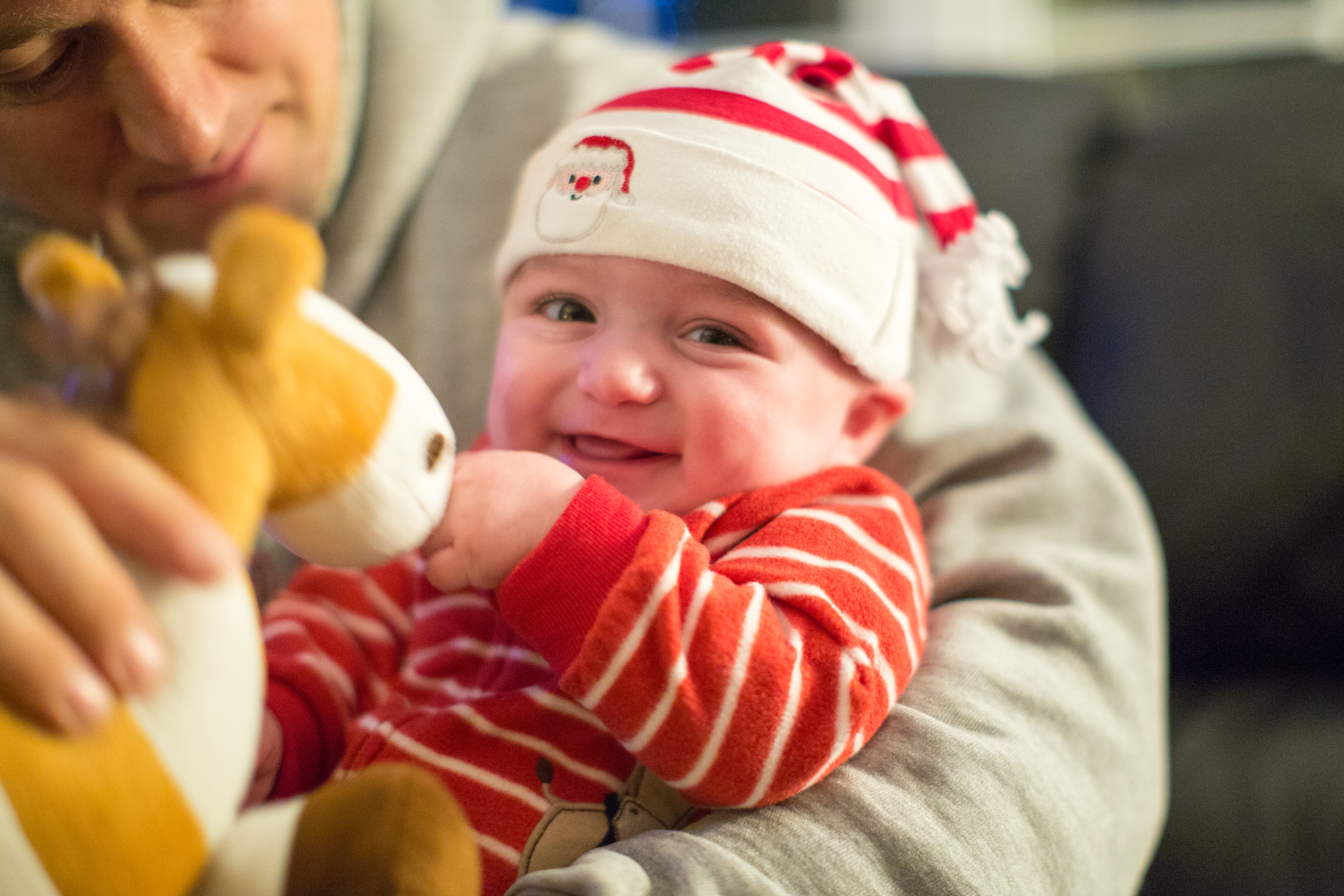 Cam has been making big changes over the past month or so, he’s getting to be so much fun and is developing such a personality. He is getting good at using his hands, and wants to feed himself all the time, even if what he grabs isn’t food… He’s getting strong too, loves bouncing and trying to stand, is sitting up great, and is on the verge of crawling. He now has three teeth with a fourth on the way!