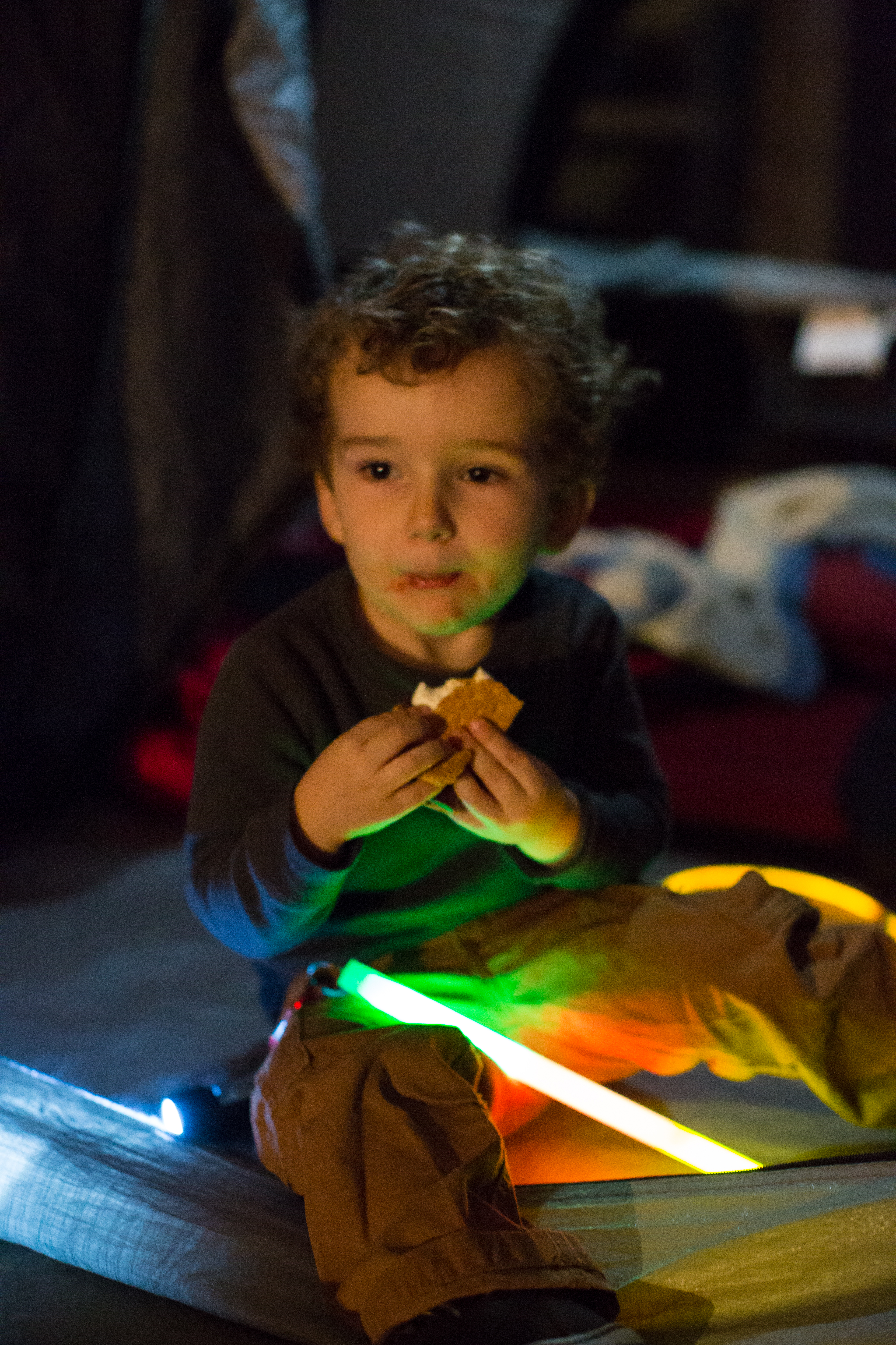 Enjoying a s’more on an overnight adventure with Dad